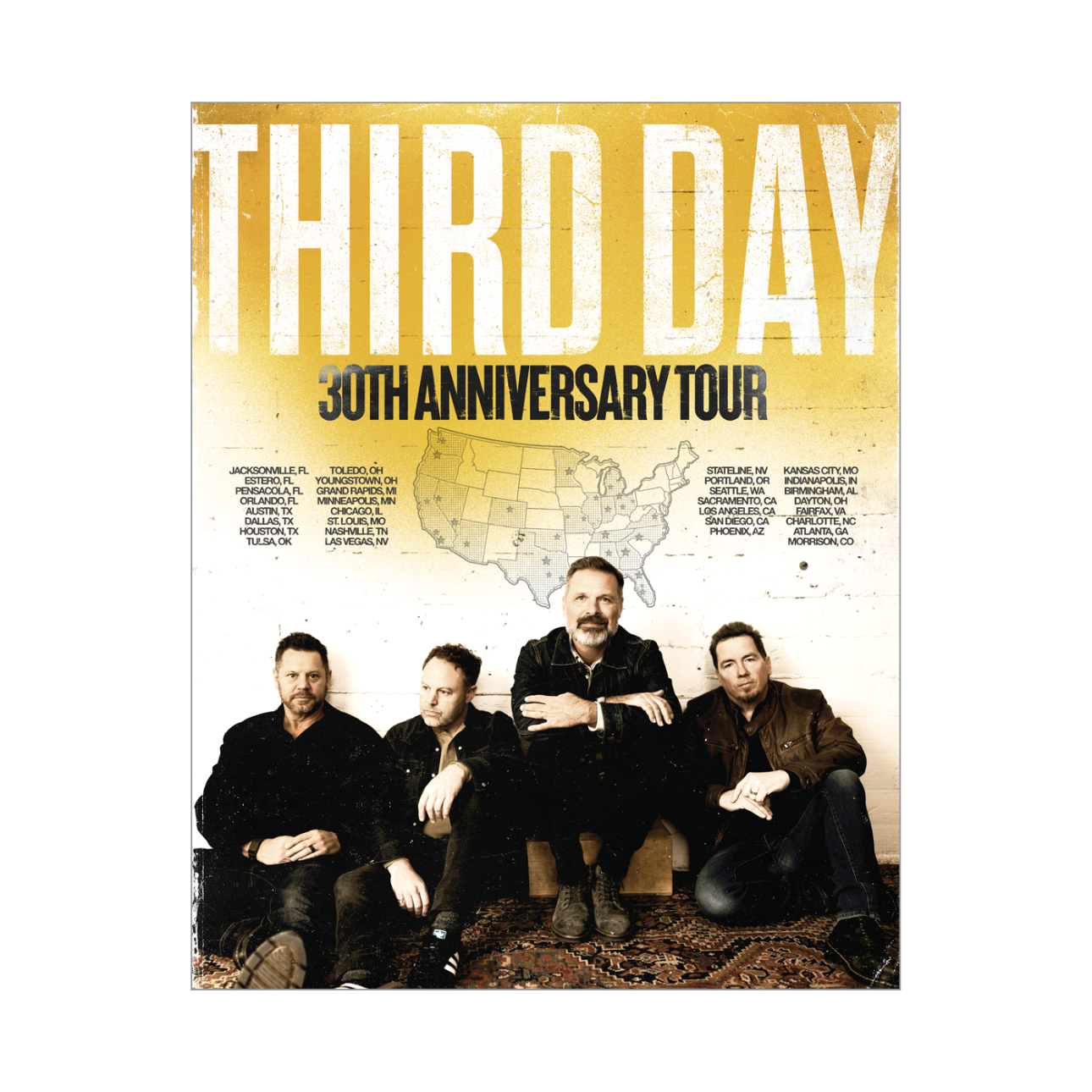 Official 'Third Day' 30th Anniversary Tour poster printed on premium heavyweight uncoated paper using high quality inks. Features the band and tour date locations.