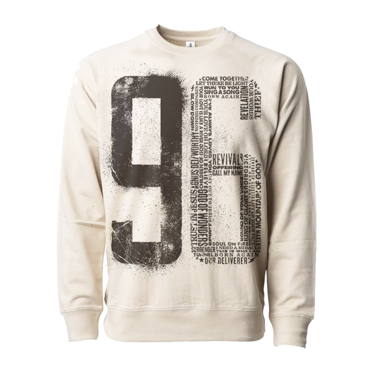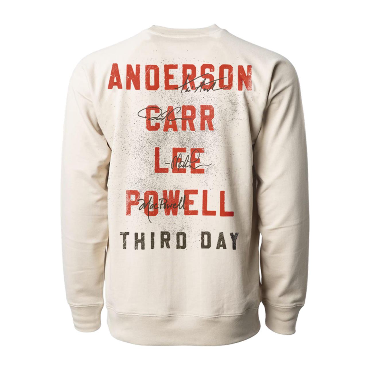 "96 Songs & Signatures" crewneck features 'Third Day' song titles on the front and band members names and signatures on the back.